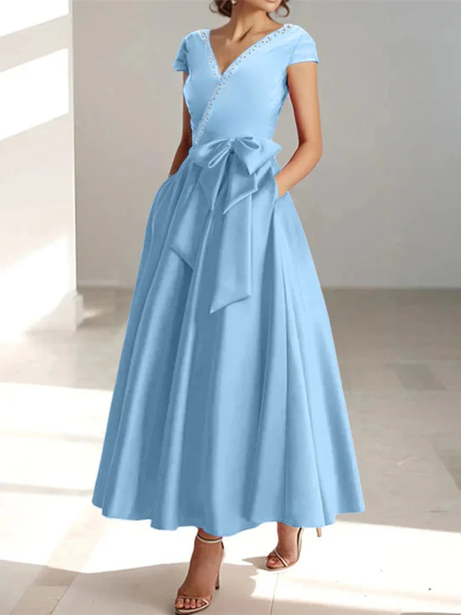 This dress is suitable for all venues, and the cut has a flattering fit and hides a tummy, so you don’t have to worry if you have a bit of a belly. Add a pair of diamond studs and a silver hairpin for an elegant touch.