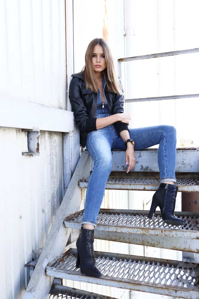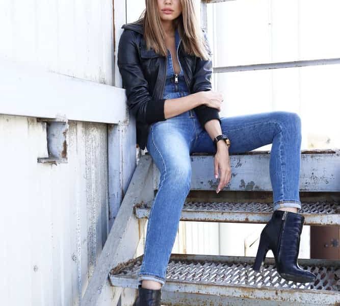 Layer on a leather jacket, add a pair of bootcut jeans, and top it with ankle boots and a gold necklace to complete the look.
